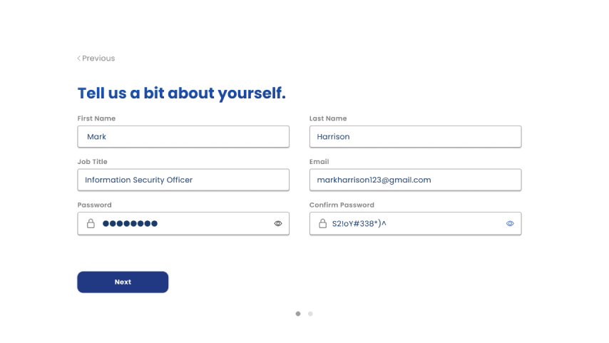 The next few pages are forms designed to capture a new user’s details and information about their organisaion in a streamlined manner.